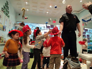 Today was our eagerly awaited Firefighter Visit. We were visited by two of Toronto's finest Firefighters who read us two great stories explaining to us what smoke detectors are and what they do. We then got to see their equipment and they even dressed up Ms Becky for us! The firefighters gave everyone a great red firefighter helmet and sticker. We surprised the Firefighters with a thank you card that the children made. Thank you for coming and visiting us Firefighters!