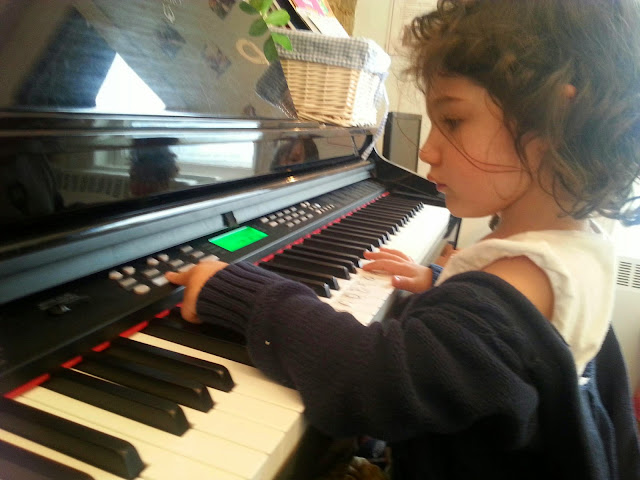 Today we took an opportunity to head to the music room for an impromptu music class! We took turns playing the piano and singing our favourite songs. Next we played a game where we identify and compare high notes and low notes, it was so much fun! We love hearing all the different instrument 'voices' on the piano too :)